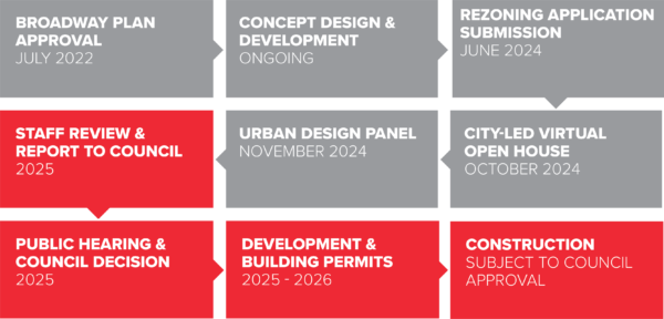 PCI and Low Tide submitted a Rezoning Enquiry in September 2022, following the implementation of the recently approved Broadway Plan. A Rezoning Application was submitted in June 2024. The Rezoning Application will then go through a City-led community input period lasting around 12-18+ months, culminating in an eventual Public Hearing in front of City Council.
